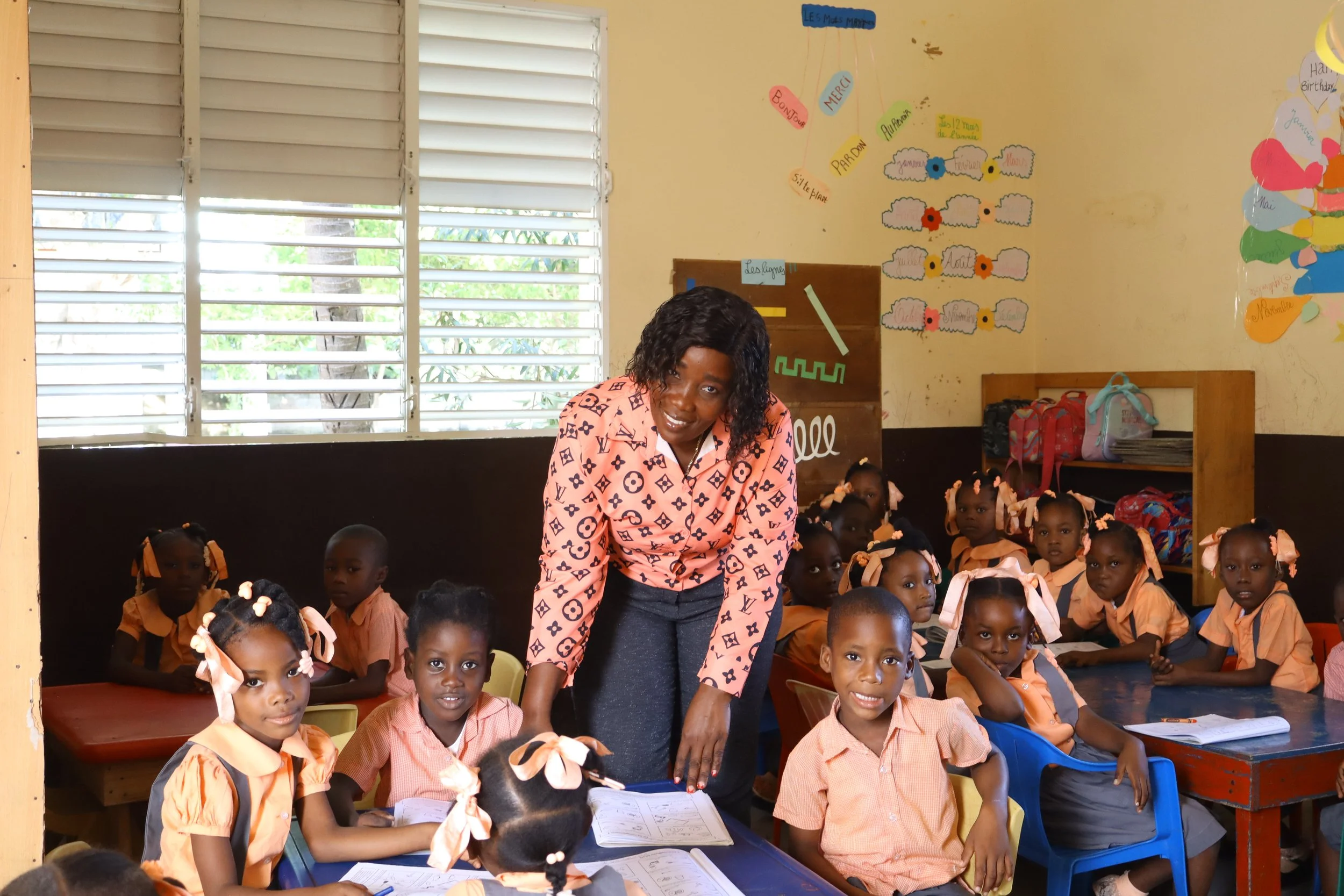 Natalia Boyo who manages the Preschool and Kindergarten, shown with her class.